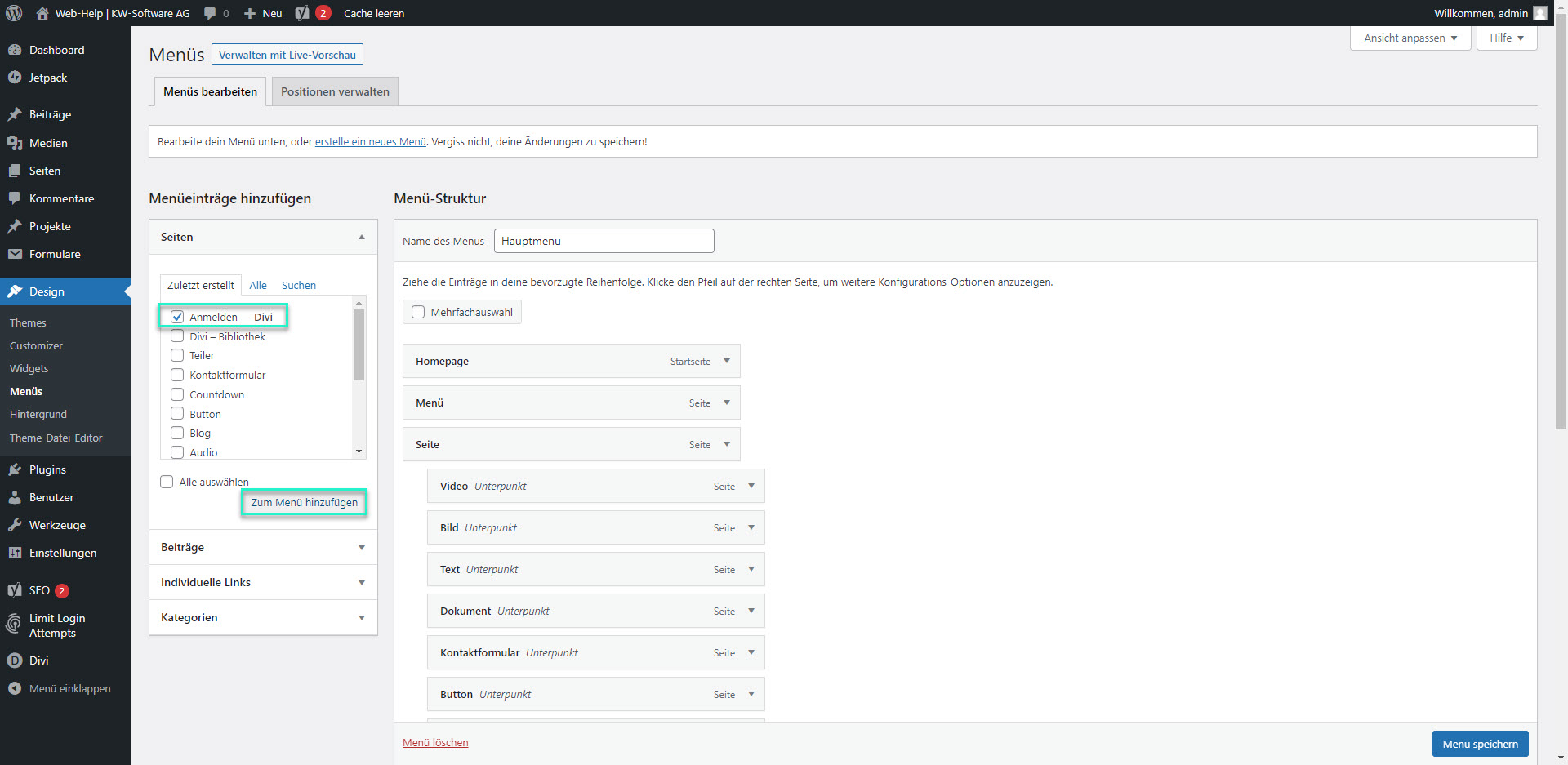 Gehen Sie im Dashboard bei “Design” unter “Menüs”. Wählen Sie die von Ihnen erstellte Seite, indem Sie den Hacken bei dem entsprechenden Punkt setzten. Drücken Sie “Zum Menü Hinzufügen”.