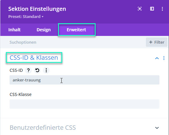 Gehen Sie unter “Erweitert” auf “CSS-ID & Klassen” . Setzten Sie in der CSS-ID den Anker “anker-variable”. Kopieren Sie die URL der aktiven Seite während Sie noch im Divi Builder sind.