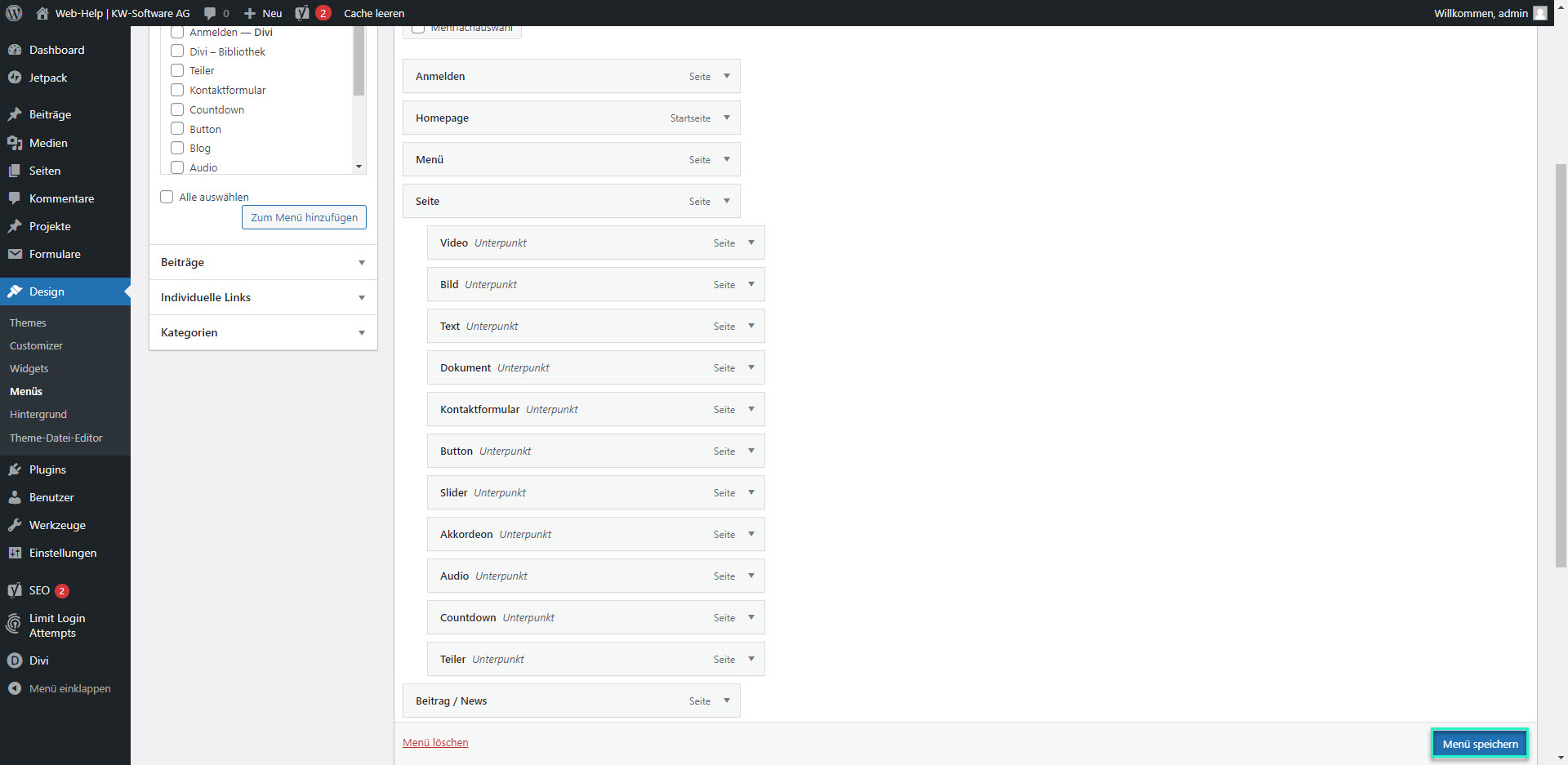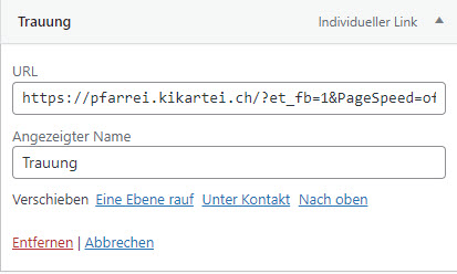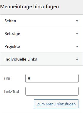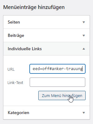 Gehen Sie im Dashboard bei “Design” unter “Menüs”. Gehen Sie auf “Individuelle Links”, fügen Sie dort die kopierte URL ein und setzten Sie den Anker “#anker-variable” an. Die URL würde dann so aussehen: https://web-help.kw-software.ch/?page_id=16&et_fb=1&PageSpeed=off#anker-variable. Klicken Sie auf “Menü” hinzufügen.