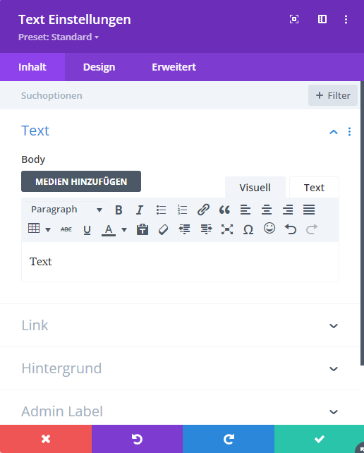 Es öffnet sich die Einstellung. Unter “Inhalt” können beim Punkt “Text” den Inhalt schreiben welcher angezeigt werden soll.