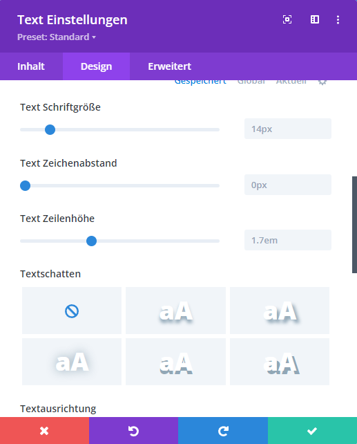 Textschattenunschärfe: Sie können die Textschattenunschärfe definieren, indem Sie ein Werten eingeben oder den Punkt auf der Leiste verschieben.