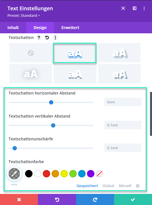 Textschatten: Sie können eine Textschattenart wählen. Wenn Sie eine auswählen öffnen sich weitere Textschatten Auswahlmöglichkeiten.