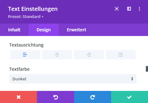Hinweis: Wenn Sie keine “Textfarbe” definiert haben und Sie “Hell” wählen, wird die Schrift weiss und Sie werden den Text auf einem hellen Hintergrund nicht sehen.