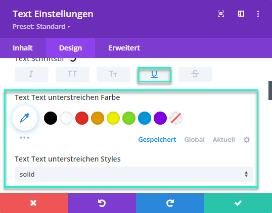 Text unterstrichen: Wenn Sie beim Schriftstil wählen, dass Sie einen unterstrichenen Text möchten, können Sie noch die Farbe, sowie den Stil des Unterstriches wählen.