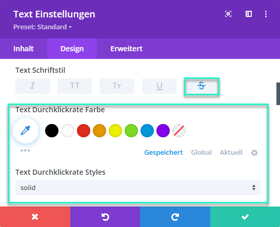 Text durchgestrichen: Wenn Sie beim Schriftstil wählen, dass Sie einen durchgestrichenen Text möchten, können Sie noch die Farbe, sowie den Stil des Durchstriches wählen.