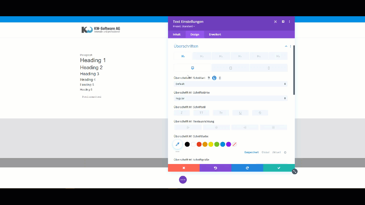 Bei “Design” unter dem Punkt 2 “Überschriften” können Sie die einzelnen Überschiften individuell gestalten. Die Einstellungen sind die gleichen, wie beim Text und können individuell eingerichtet werden.