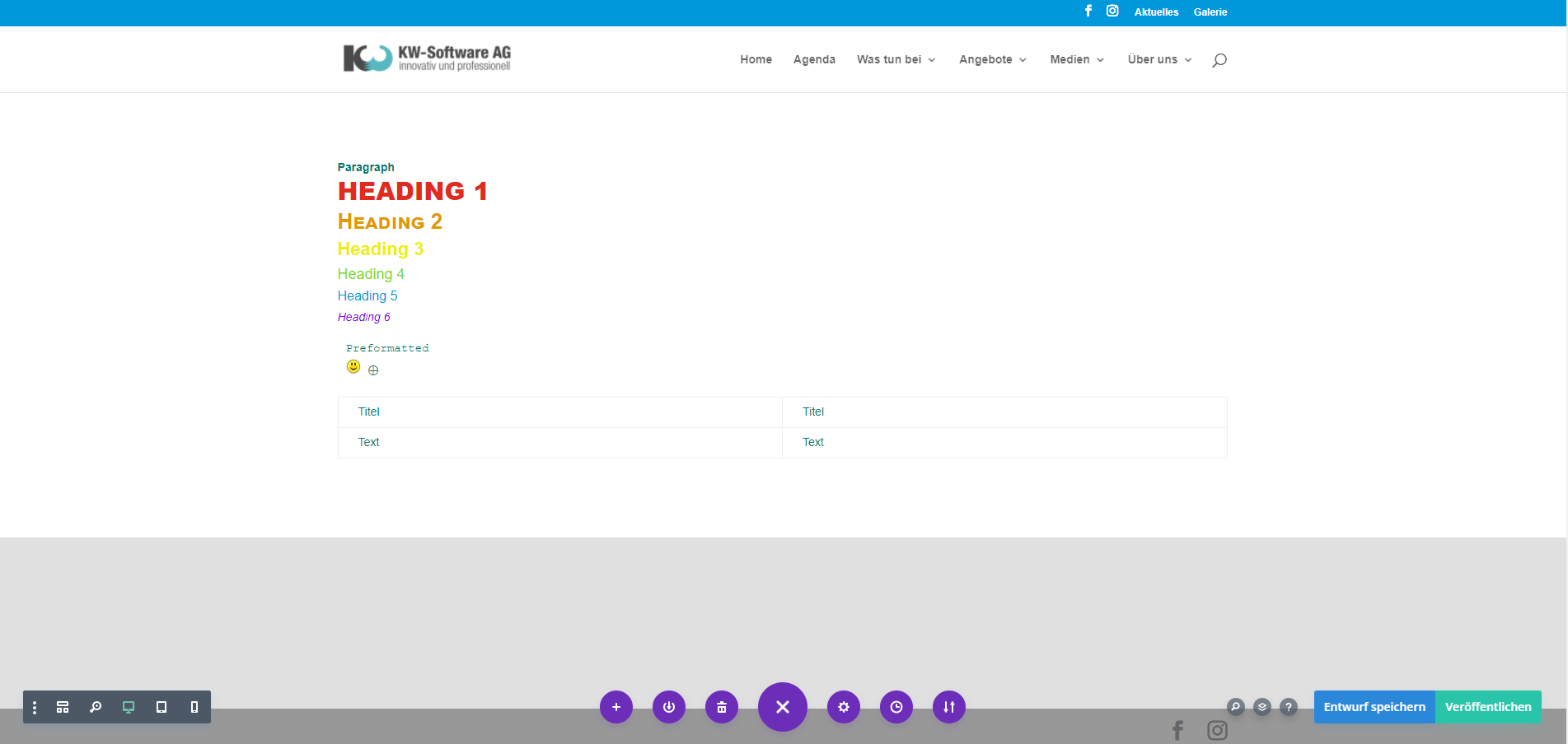 Wenn Sie beim Inhalt Ihren Text eingeben können Sie unter “Paragraph” eine Überschriftart wählen. Wenn Sie innerhalb eines Textes mehrere Überschriften setzten möchten, trennen Sie die Zeilen mit der Entertaste.