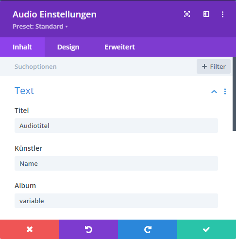 Es öffnet sich die Einstellung. Unter “Inhalt” können beim Punkt “Text” einen Titel, Künstler, sowie ein Albumname festlegen.