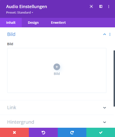 Bei den Einstellungen “Inhalt” unter dem Punkt “Bild” klicken Sie auf das graue “+” um ein Bild für das Audiofile einzufügen.
