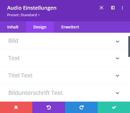 Bei den Einstellungen “Design” können Sie Bild, Text, Titel Text, Bildunterschrift Text einzeln bearbeiten