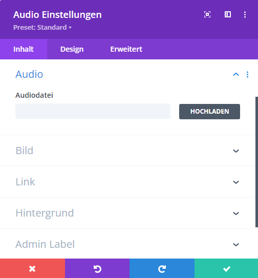 Bei den Einstellungen “Inhalt” unter dem Punkt “Audio” klicken Sie auf “Hochladen”.
