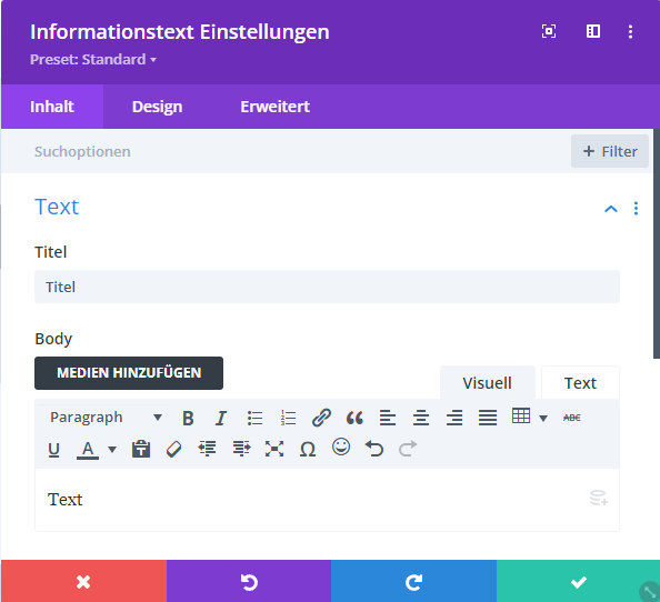 Es öffnet sich die Einstellung. Unter “Inhalt” können Sie beim Punkt “Text” einen Titel und unter “Body” einen Text definieren.