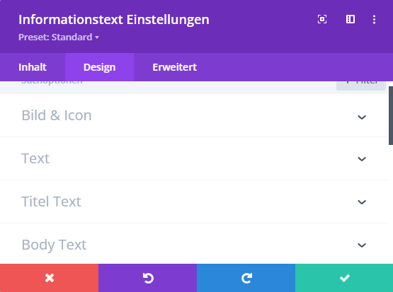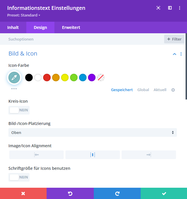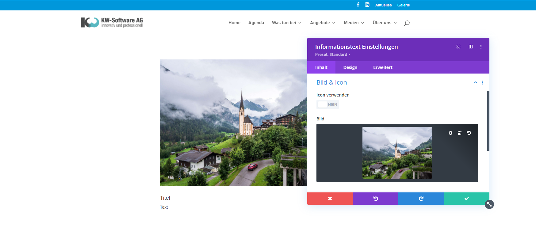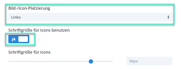 Bild-/Icon-Platzierung: Für Bilder empfehlen wir “oben” und für Icons “Links” als Platzierung zu wählen.