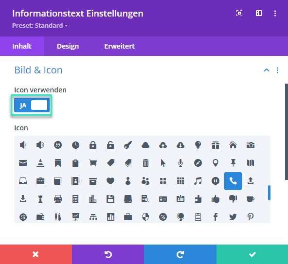 Bei den Einstellungen “Inhalt” können Sie zwischen einem “Icon” und einem “Bild” wählen.