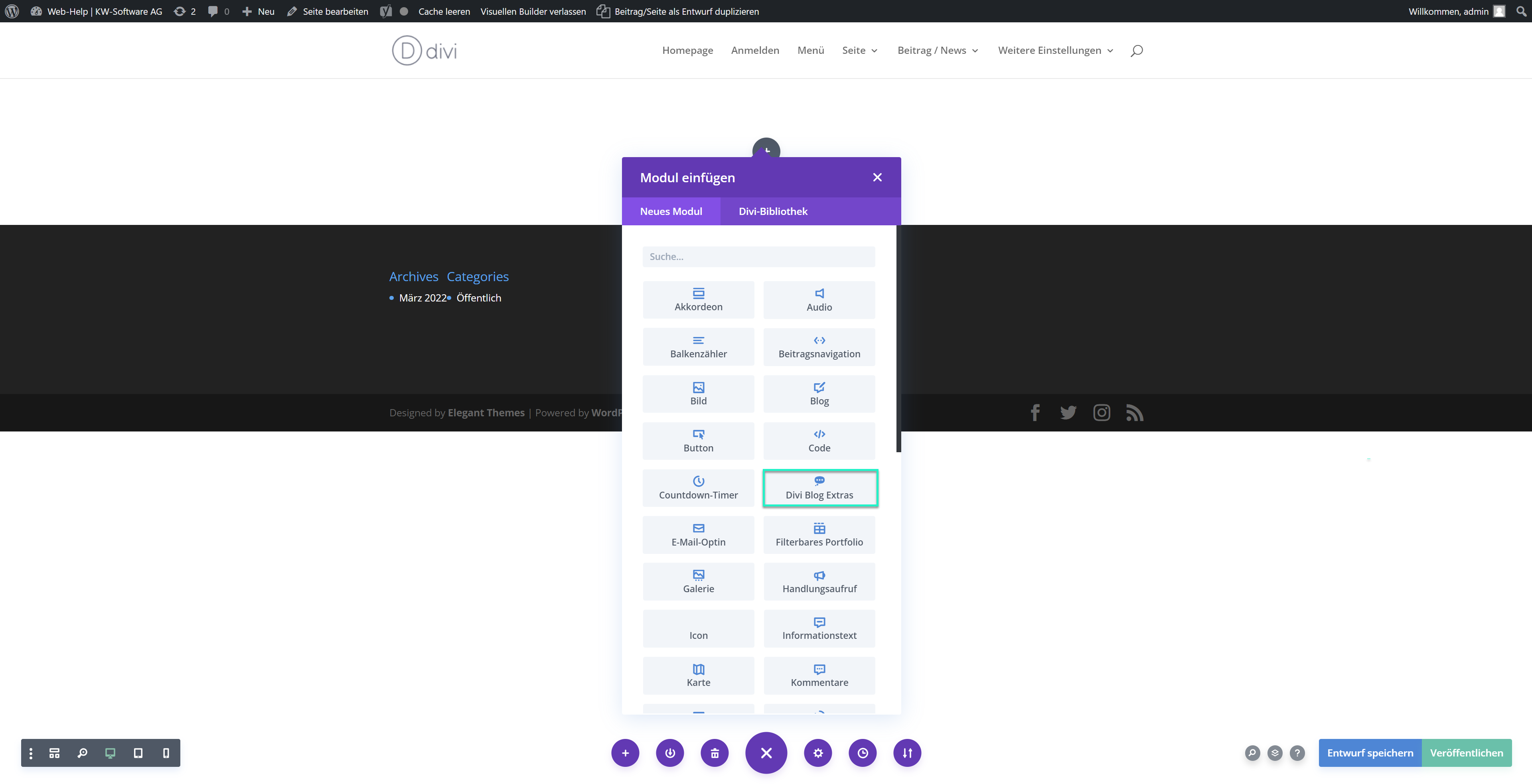 Fügen Sie das “Divi Blog Extras” Modul ein.