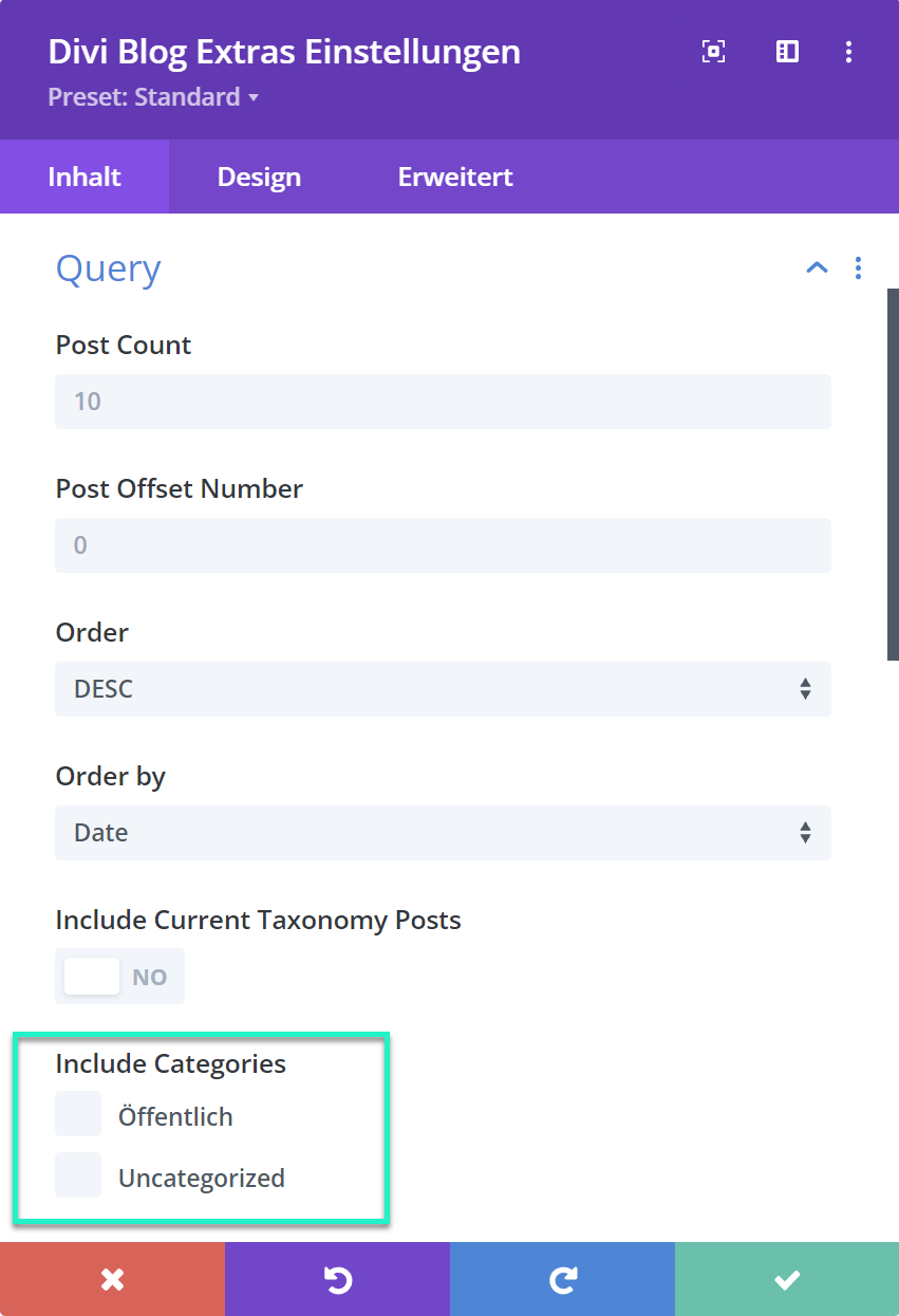 Include Categories: Sie wählen die Kategorie aus, welche Sie anzeigen möchten.