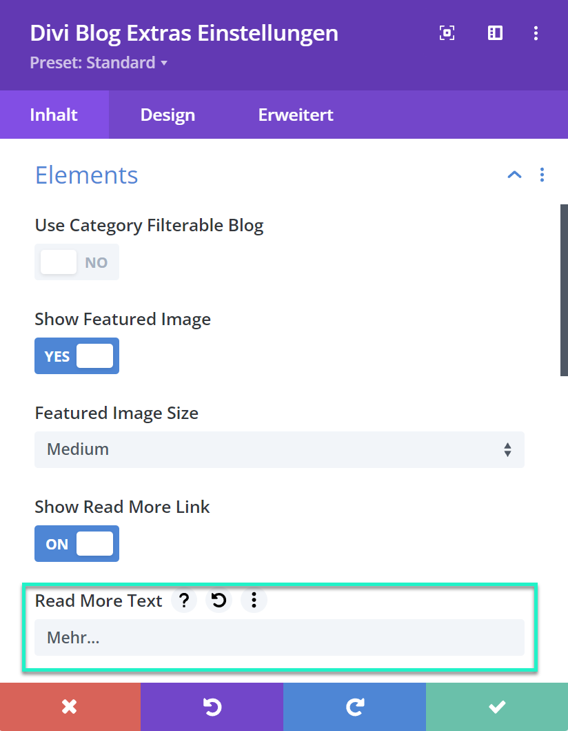 Read More Text: Sie können den Link-Text festlegen welcher zum “Weiterlesen” erscheinen soll.