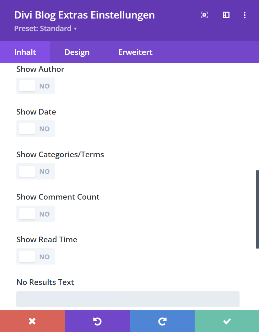 No Result Text: Man kann einen Text eingeben, welcher erscheint wenn der Beitragstext nicht angezeigt werden kann.