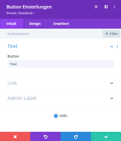 Es öffnet sich die Einstellung. Unter “Inhalt” beim Punkt “Text” können Sie den Inhalt schreiben, welches auf dem Button angezeigt werden soll.