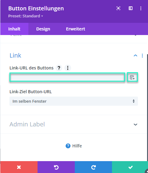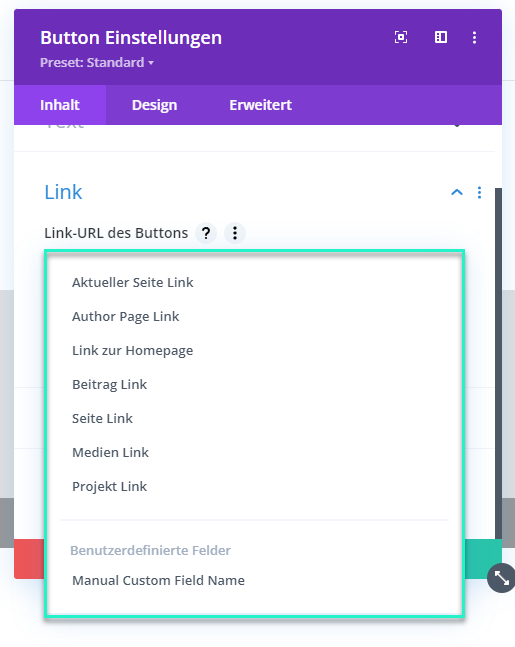 Unter “Inhalt” beim Punkt “Link” können Sie entweder einen eigenen Link angeben oder auf das Icon gehen “Dynamischen Inhalt verwenden”.