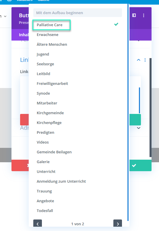 Wenn Sie “Seite Link” benutzen, öffnet sich ein Dropdown mit allen Seiten Ihrer Website.