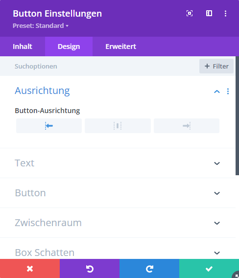 Unter “Design” beim Punkt “Ausrichtung” können Sie die Ausrichtung des Button Inhaltes wählen.