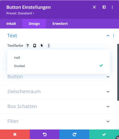 Beim Punkt “Text” haben Sie die Möglichkeit zu entscheiden, ob der Text “Hell” oder “Dunkel” sein soll.