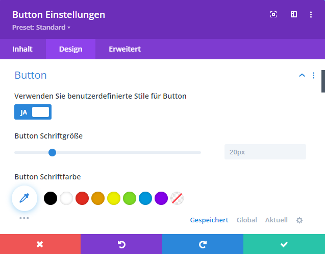 Beim Punkt “Button” haben Sie die Möglichkeit benutzerdefinierte Stile für Ihr Button einzurichten. Wenn Sie dies mit “Ja” bestätigen, öffnen sich weitere Punkte zum Thema “Button”.