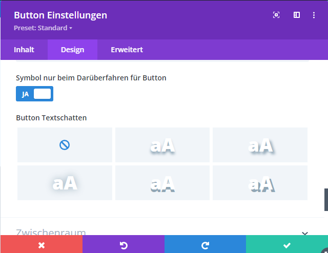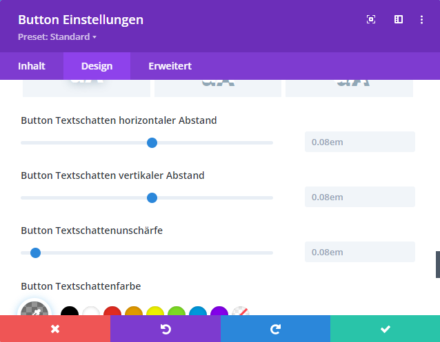 Button Textschatten: Sie können eine Textschattenart wählen. Wenn Sie eines auswählen, öffnen sich weitere Textschatten Einstellungen.