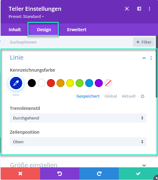 Es öffnet sich die Einstellung. Unter “Design” können Sie beim Punkt “Linie” die Farbe, den Stil und die Position der Linie wählen.