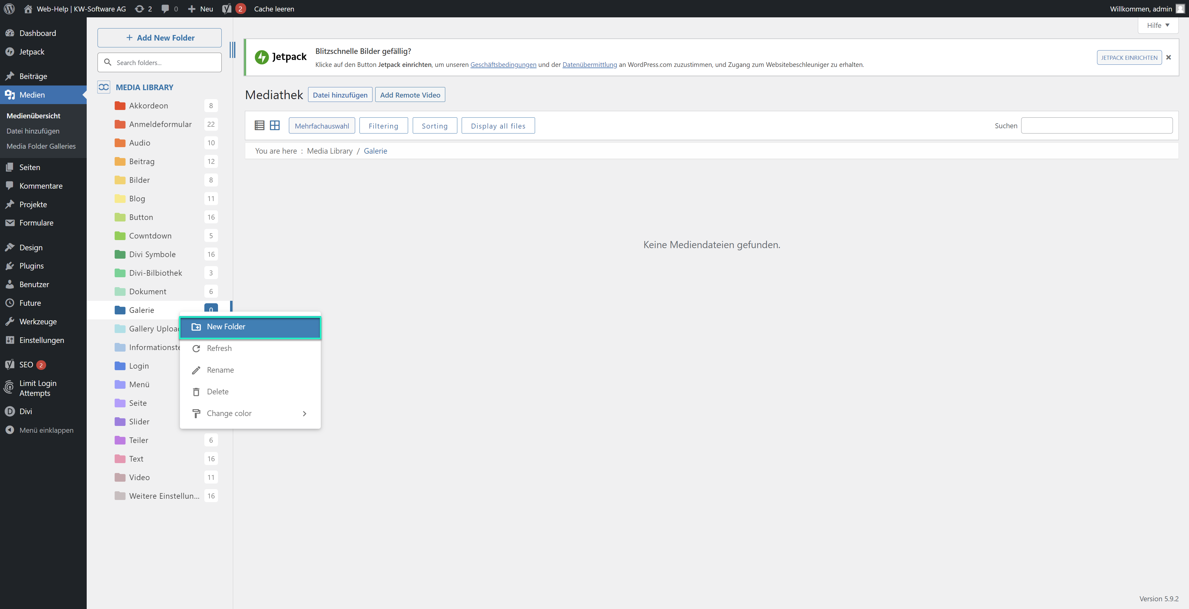 Gehen Sie im WordPress unter “Medien” auf “MEDIA LIBRARY“ und anschliessend auf “Add New Folder”.