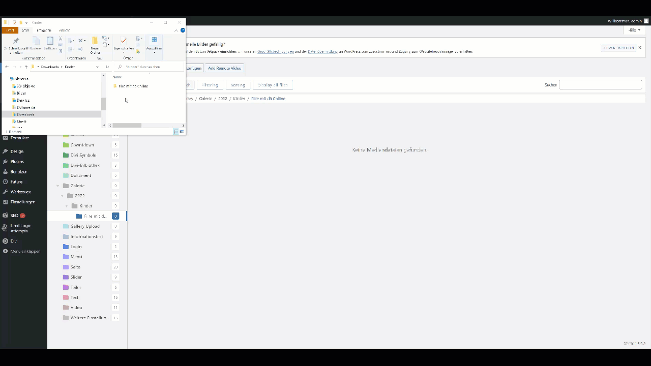 Öffnen Sie den Explorer mit dem Gewünschten Bildern und ziehen Sie entweder die einzelnen Bilder oder den ganzen Ordner via drag & drop in den leeren Bereich im Divi-Ordner.