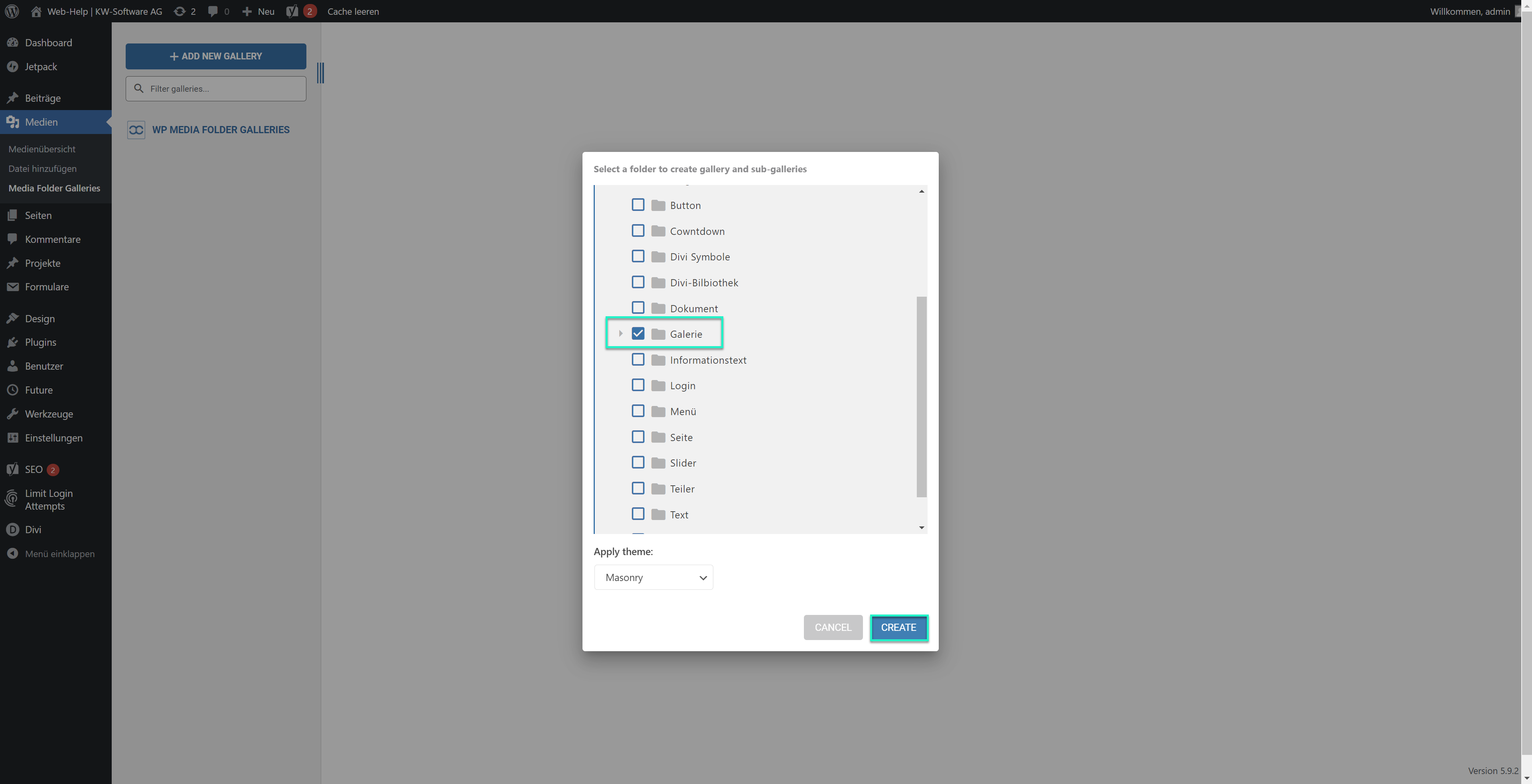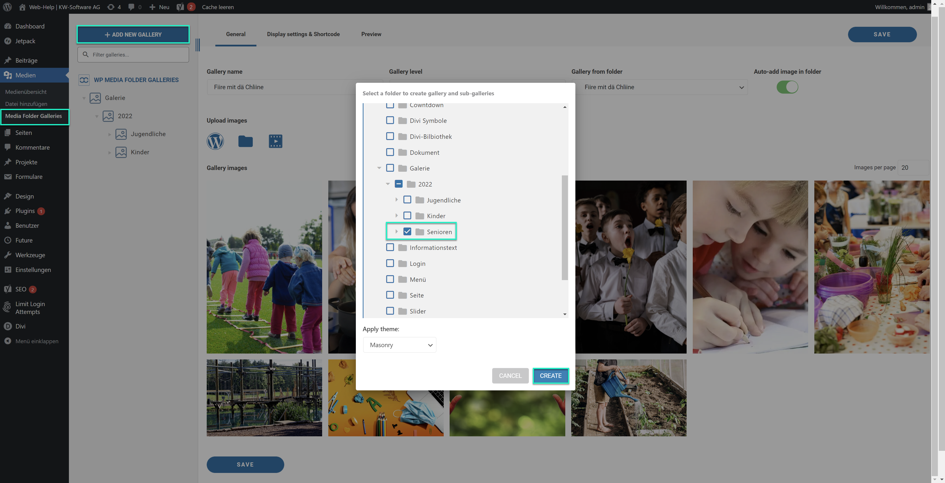 Gehen Sie im WordPress unter “Medien” bei “Media Folder Galleries”. Unter “ADD A NEW GALERIE” wählen Sie “Quick gallery from folder”. Es öffnet sich ein Fenster, bei dem Sie Ihren gewünschten Ordner wählen können.